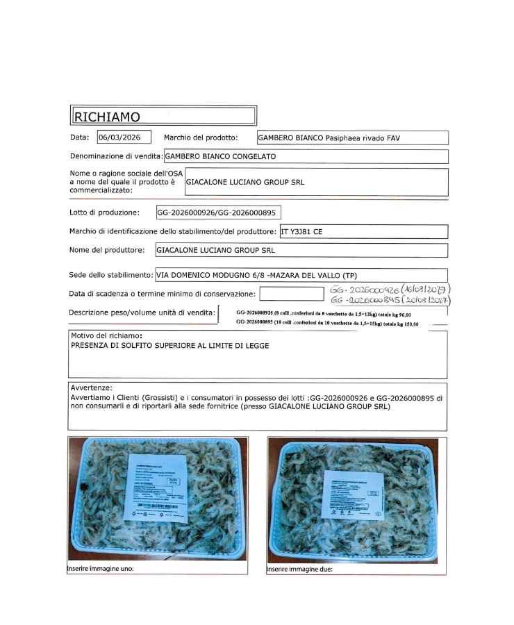 Stavolta, il richiamo riguarda i gamberi bianchi (conosciuti tecnicamente come Pasiphaea sivado) commercializzati dalla ditta Giacalone Luciano Group Srl. Il motivo che ha spinto le autorità a ritirare la merce dagli scaffali è la presenza di solfiti in quantità superiori ai limiti previsti dalla normativa vigente. Sebbene i solfiti siano additivi autorizzati per prevenire l’annerimento del pesce, il superamento delle soglie di legge rappresenta un rischio concreto, poiché queste sostanze possono scatenare reazioni avverse in soggetti sensibili.